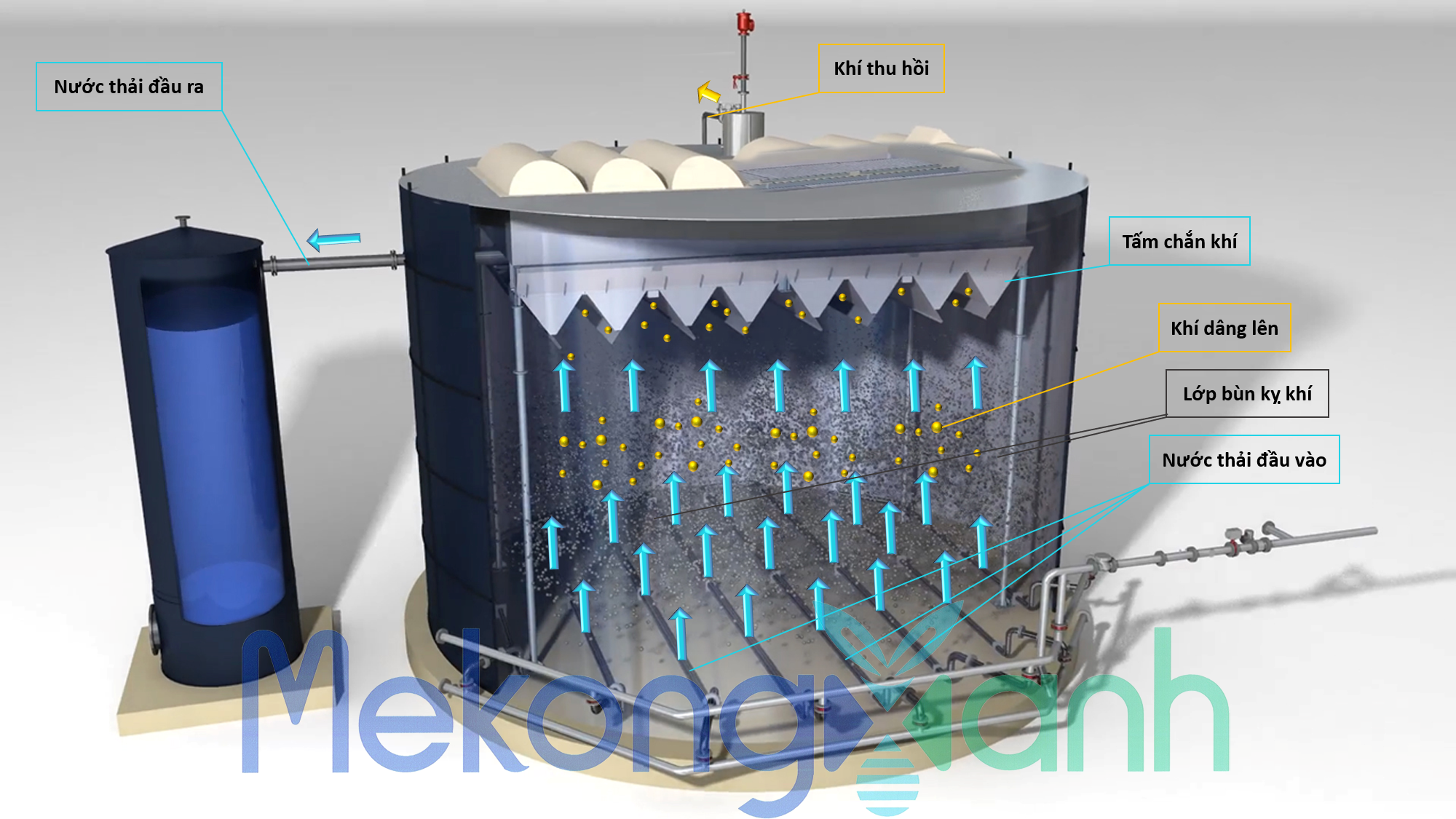 The CSTR technology includes a continuously stirred anaerobic digester followed by a degassing tank to remove excess biogas and a settling tank to separate the treated water and biomass. This technology is a good choice for anaerobic digestion of wastewater with high concentrations of suspended solids and COD, which can create flocs between biomass and suspended solids in influent wastewater through agitation. evenly throughout the tank. Thanks to this floc formation mechanism, the biomass and undissolved suspended solids will be collected at the bottom of the clarifier and then recirculated back to the CSTR tank to maintain the necessary microbial density and compost. further destroy this residue. With a large amount of biogas generated from the CSTR tank, usually a gas storage unit will be provided with this tank to store gas and fuel, serving the use of boilers or generators, helping to save energy. consumption for investors.